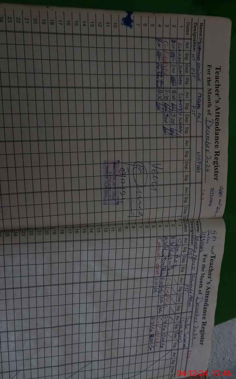 | Remarks (Use Separate Page if Required): Sir teachers and students attendence on sis not carried out NSB cashbook not shown to mea for verification Wapda not available but DC Sollar available Books record not shown | |||||