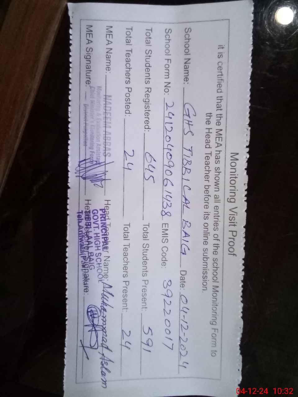 | EMIS Code: 39220017 | Name of School: GHS TIBBI LAL BAIG | |||