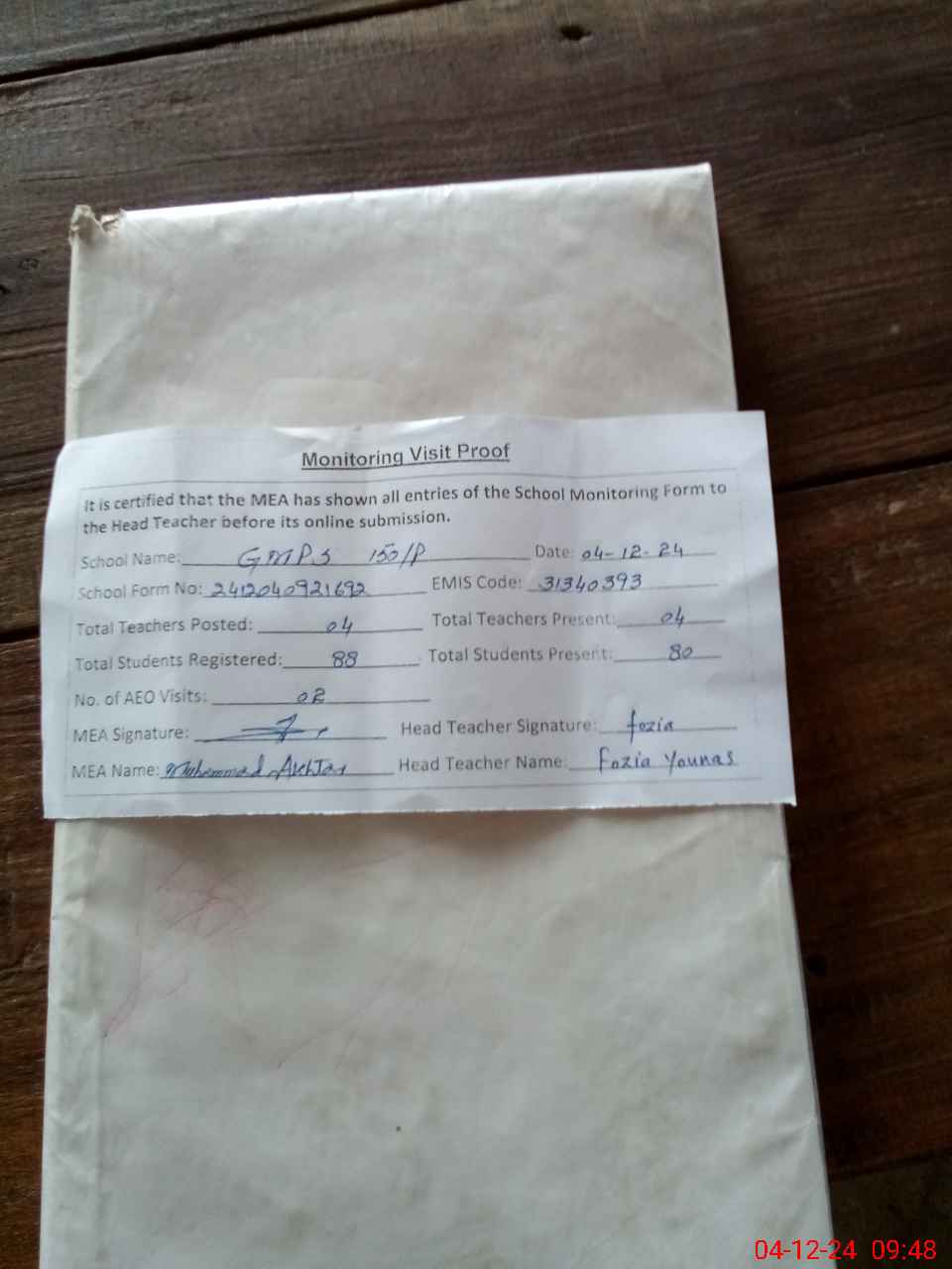 | Attendance Register | Head Teacher | MEA with School | Visit Proof |