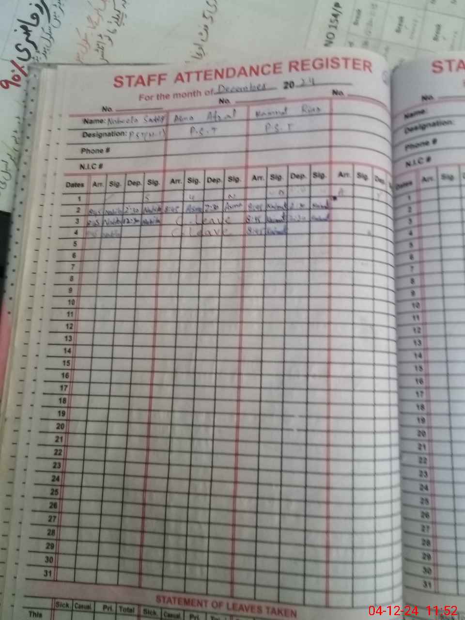 | CNIC | Full Name | Designation | R/C | Absence During Last Calender Month |