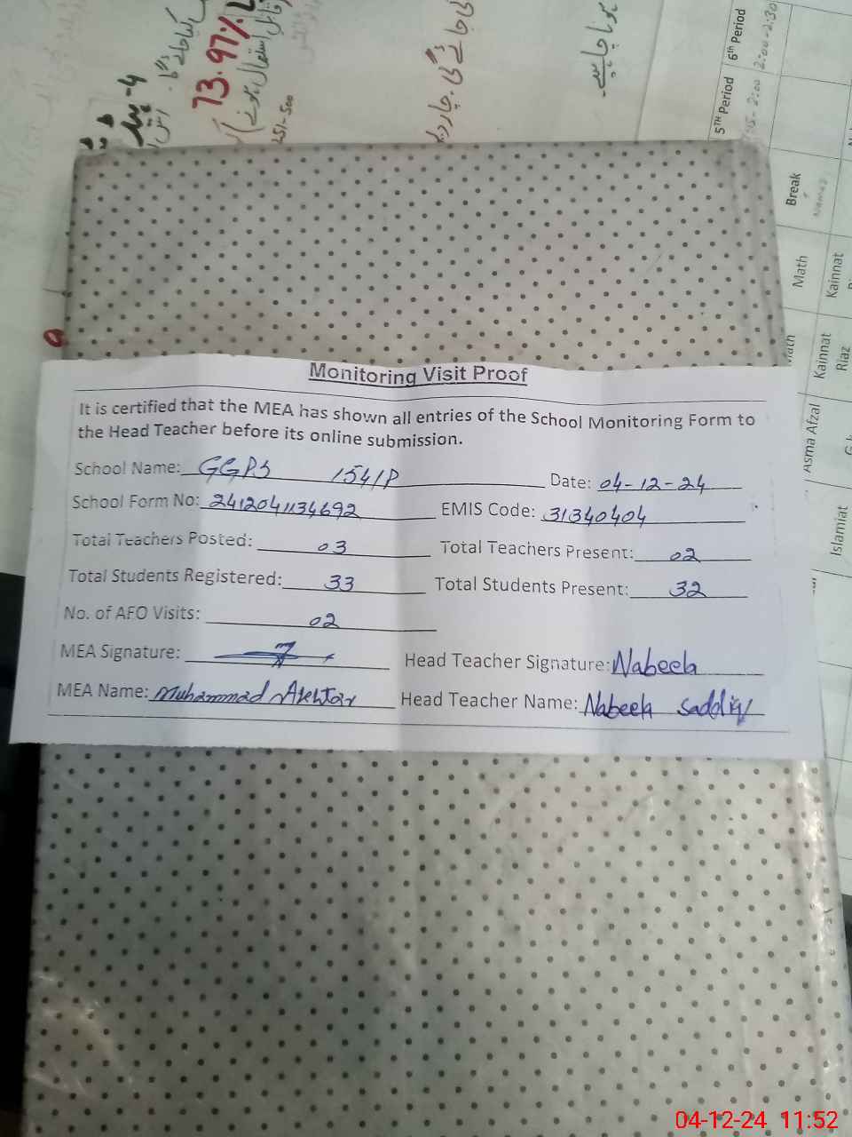 | Attendance Register | Head Teacher | MEA with School | Visit Proof |