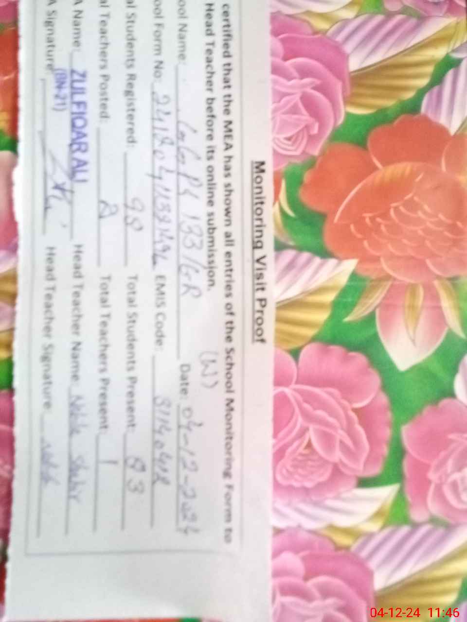| Attendance Register | Head Teacher | MEA with School | Visit Proof |