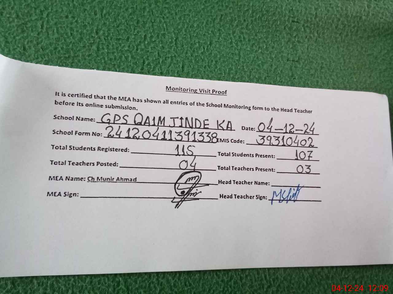 | EMIS Code: 39310402 | Name of School: GPS QAIM JINDE KA | |||