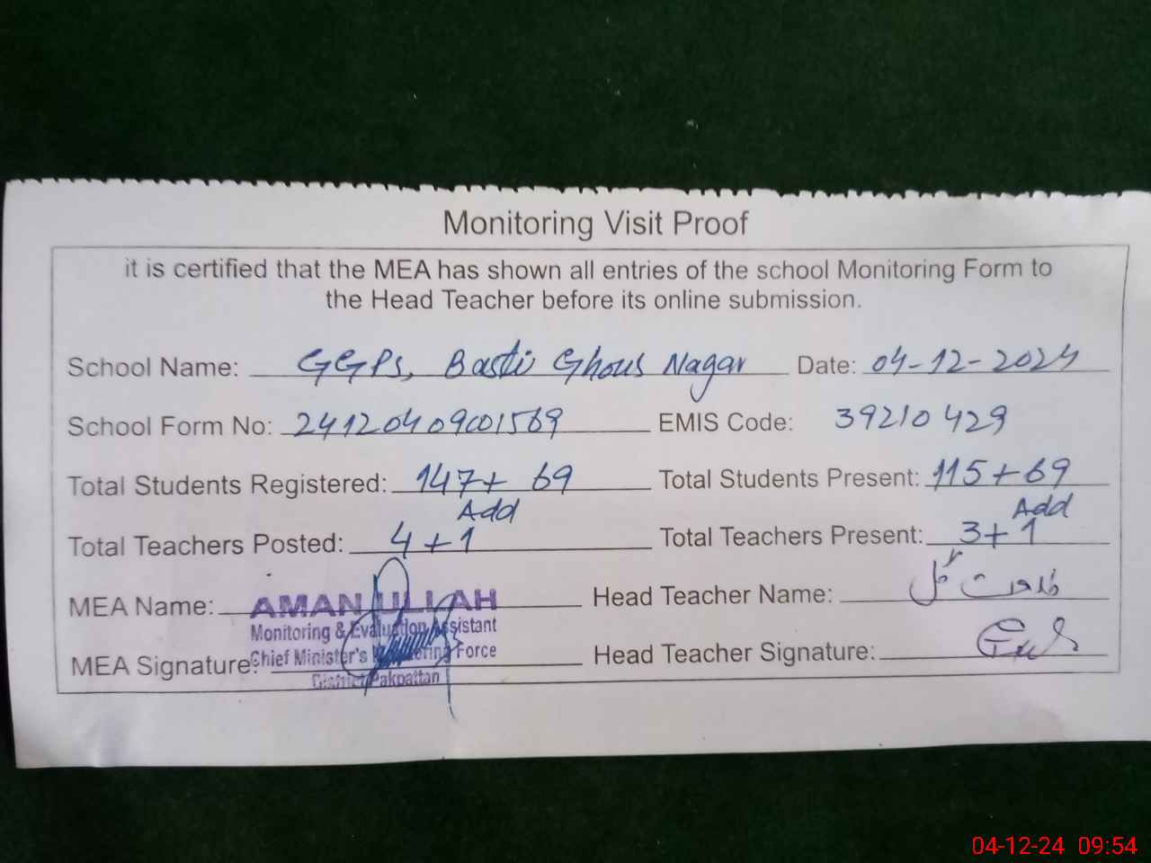 | Attendance Register | Head Teacher | MEA with School | Visit Proof |