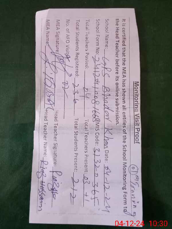 | EMIS Code: 31320365 | Name of School: GPS BAHADAR KHAN | |||