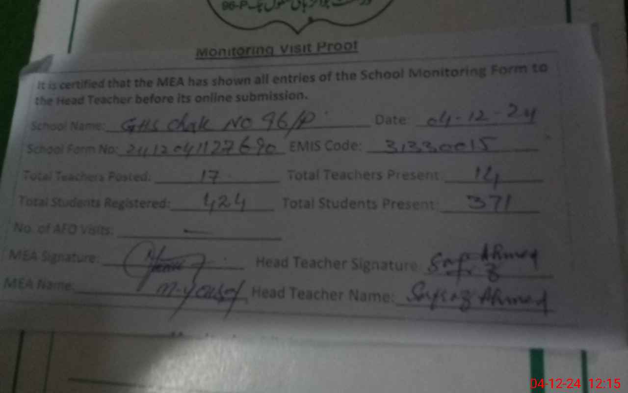 | EMIS Code: 31330015 | Name of School: GHS CHAK 96/P | |||