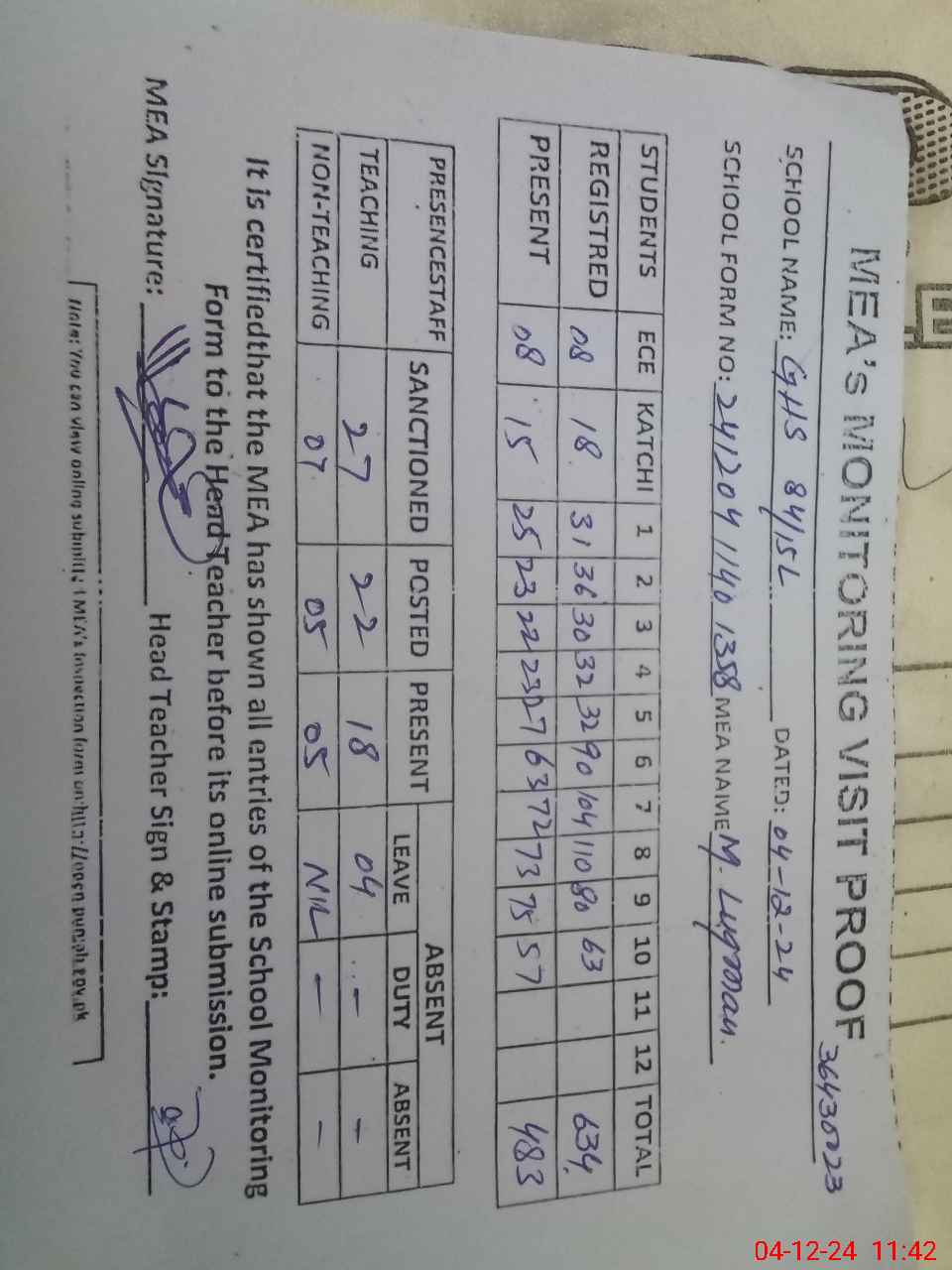 | Attendance Register | Head Teacher | MEA with School | Visit Proof |