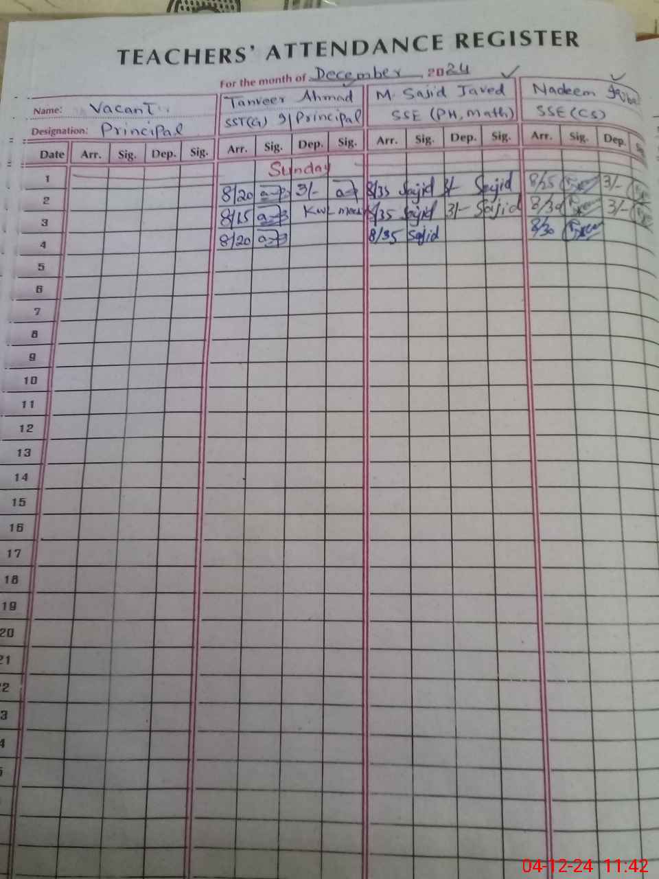 | CNIC | Full Name | Designation | R/C | Absence During Last Calender Month |