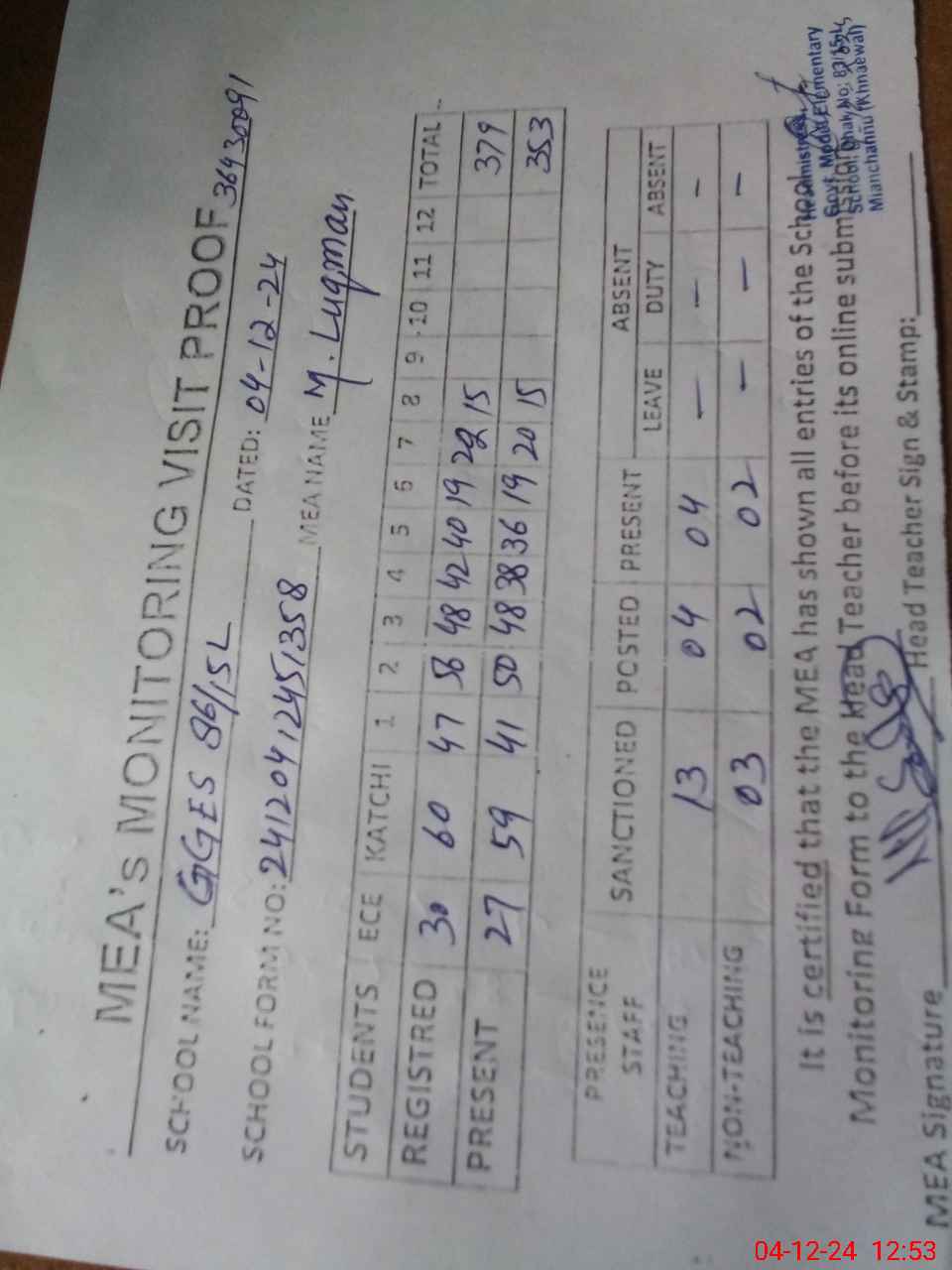 | EMIS Code: 36430091 | Name of School: GMES 83/15-L, MIAN CHANNU | |||
