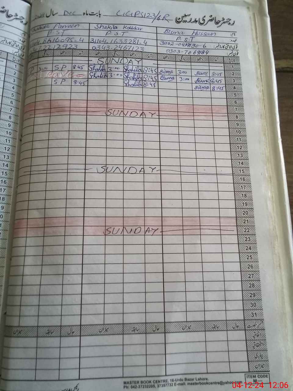 | CNIC | Full Name | Designation | R/C | Absence During Last Calender Month |