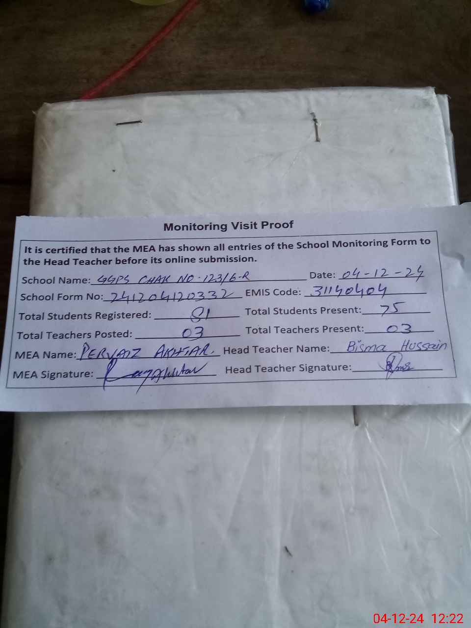| Attendance Register | Head Teacher | MEA with School | Visit Proof |