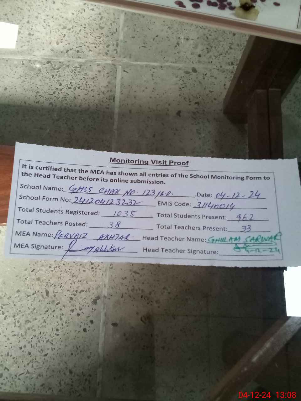 | EMIS Code: 31140014 | Name of School: GHSS CHAK 123/6-R | |||