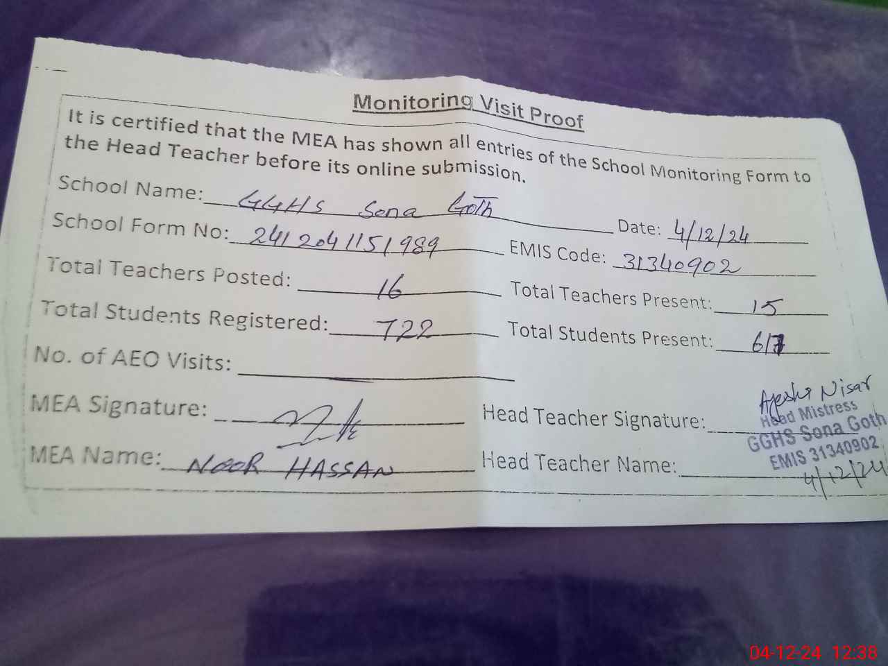 | EMIS Code: 31340902 | Name of School: GGHS SONA GOTH | |||