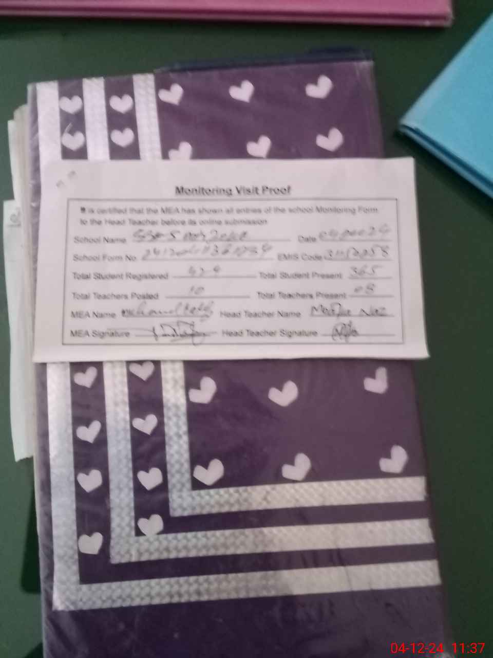 | Attendance Register | Head Teacher | MEA with School | Visit Proof |