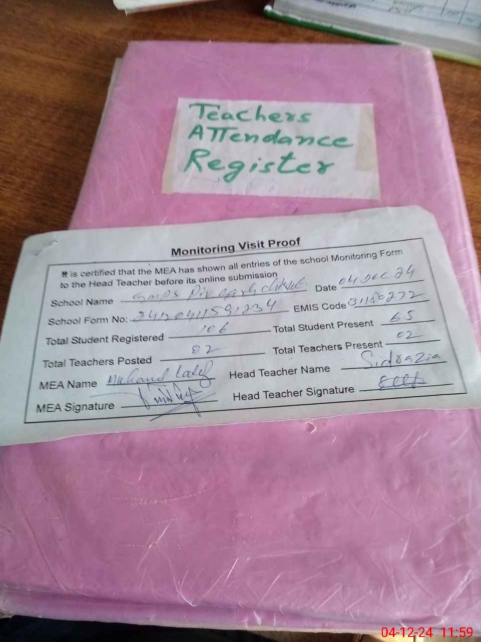 | Attendance Register | Head Teacher | MEA with School | Visit Proof |