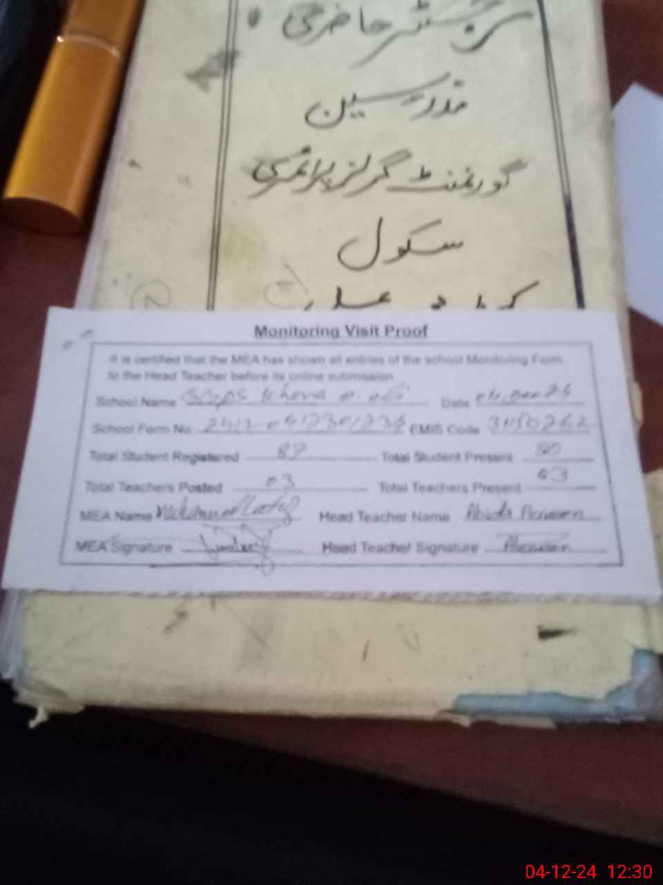 | Attendance Register | Head Teacher | MEA with School | Visit Proof |