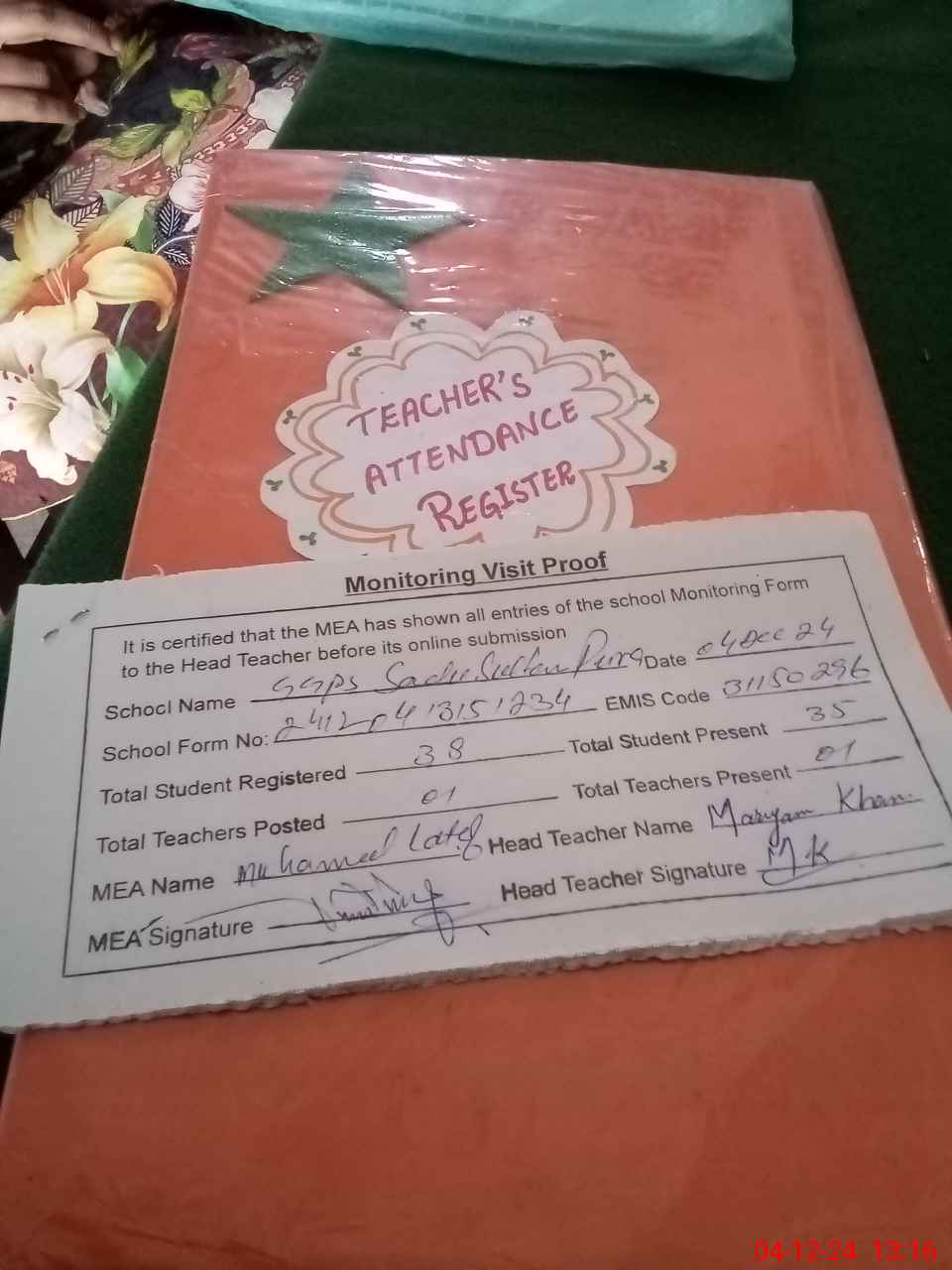 | Attendance Register | Head Teacher | MEA with School | Visit Proof |