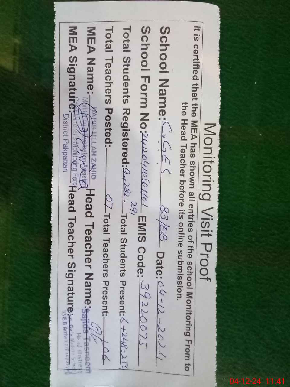 | Certified that this School was Inspected by the Undersigned MEA/DMO Today and the Information Stated Above is as Per Record. | |||||