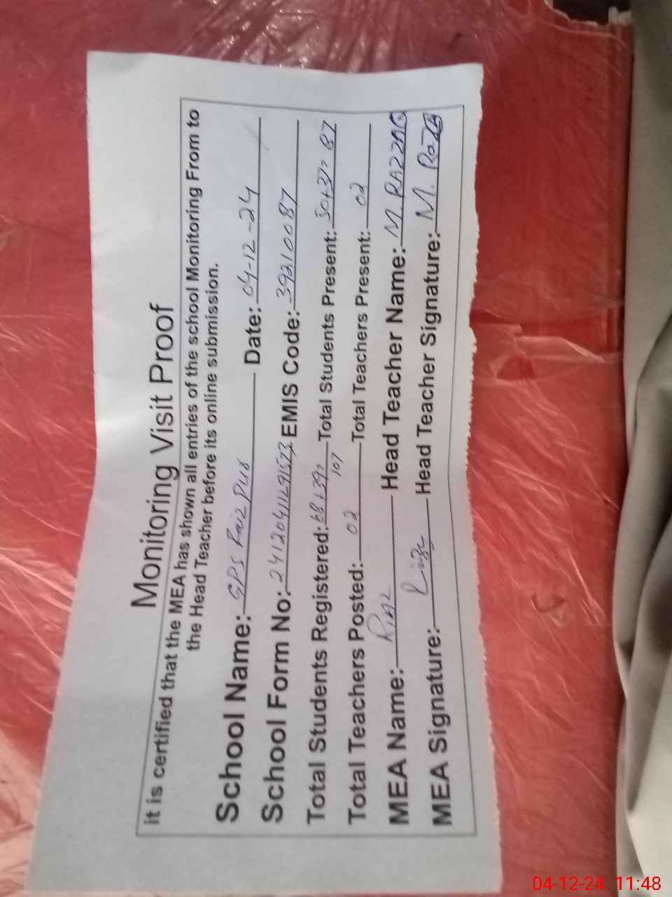| EMIS Code: 39210087 | Name of School: GPS FAIZ PUR P.O BOYLE GANJ | |||