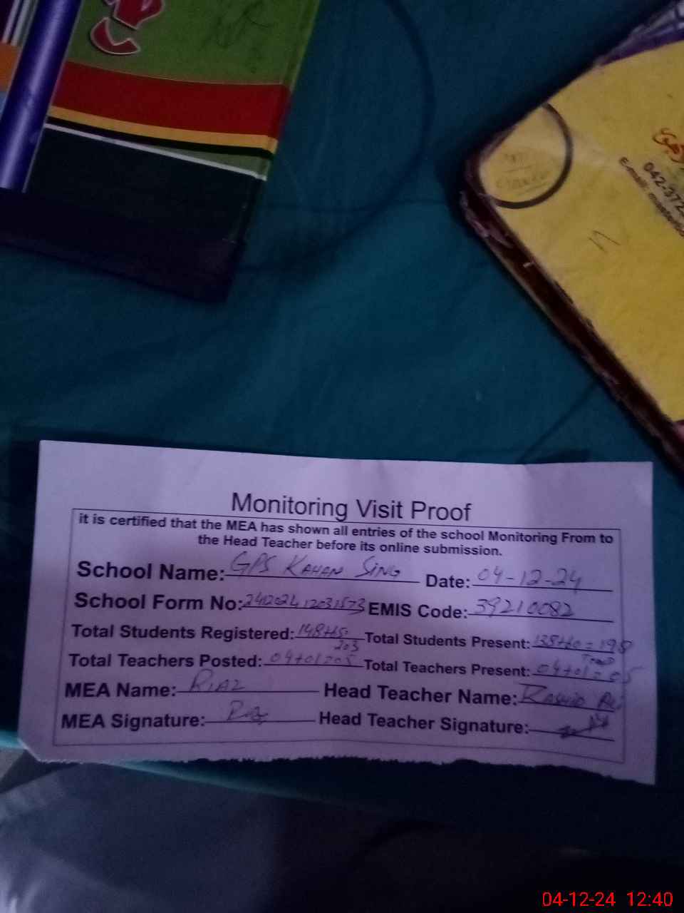 | Attendance Register | Head Teacher | MEA with School | Visit Proof |