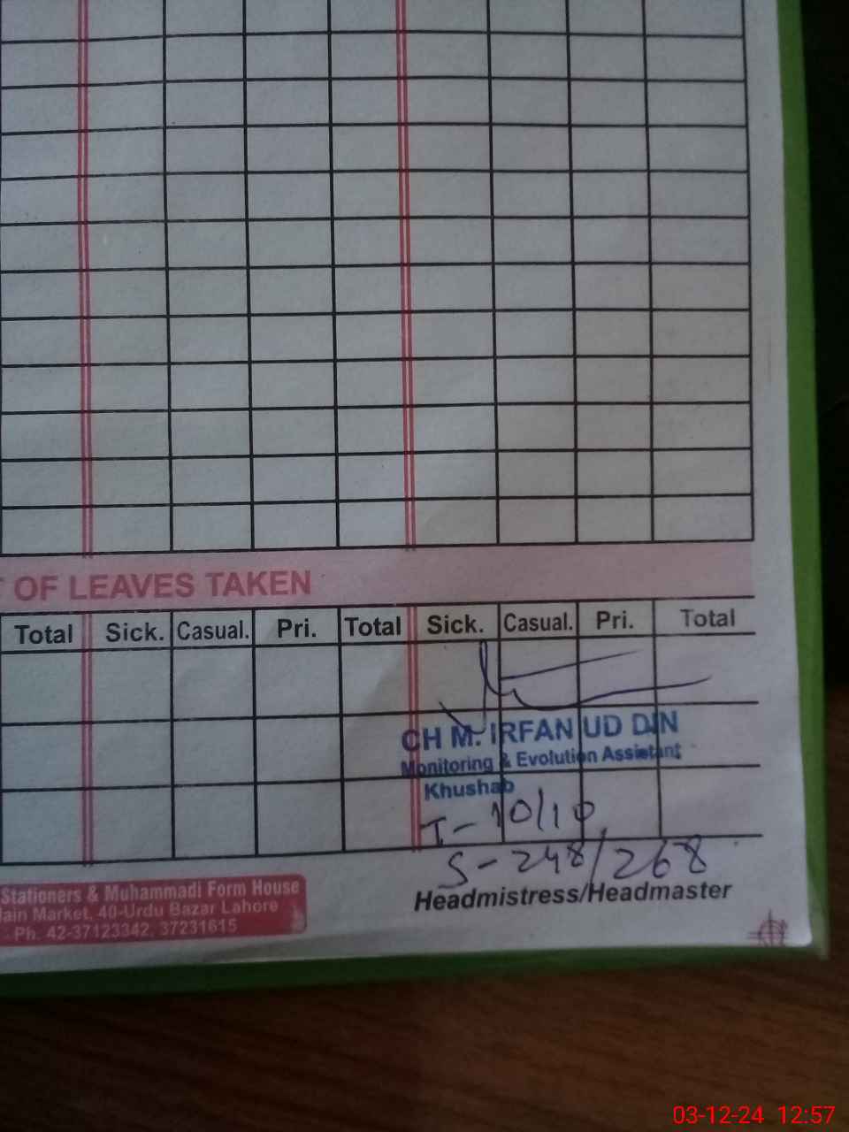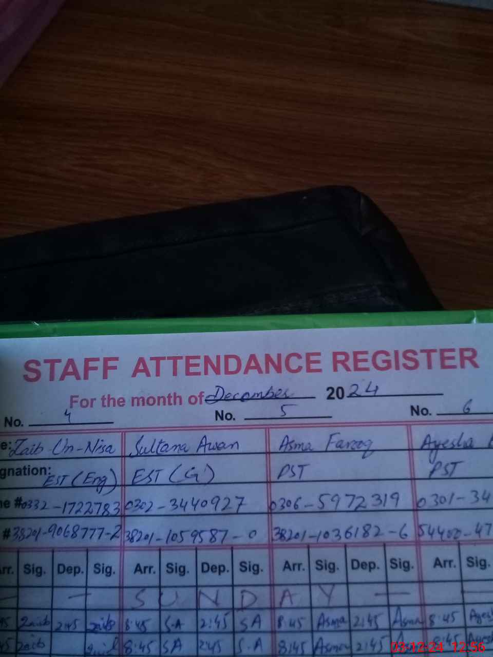| CNIC | Full Name | Designation | R/C | Absence During Last Calender Month |