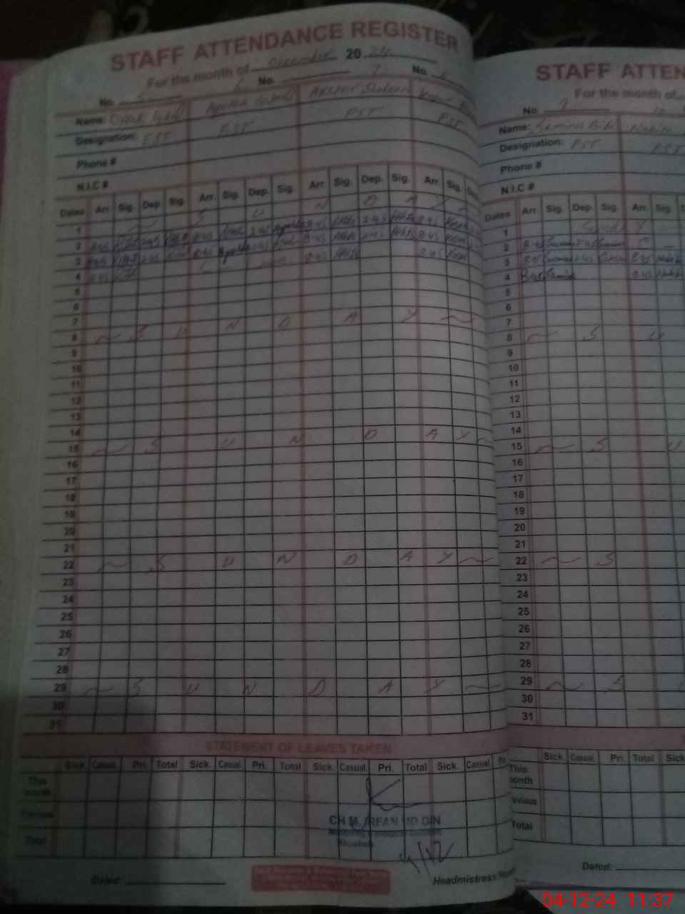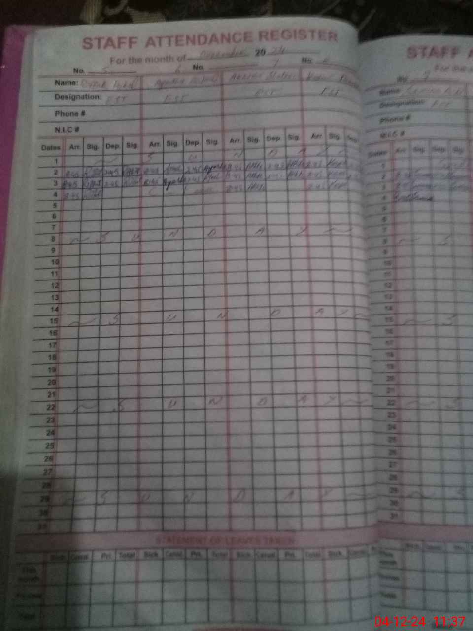 | CNIC | Full Name | Designation | R/C | Absence During Last Calender Month |