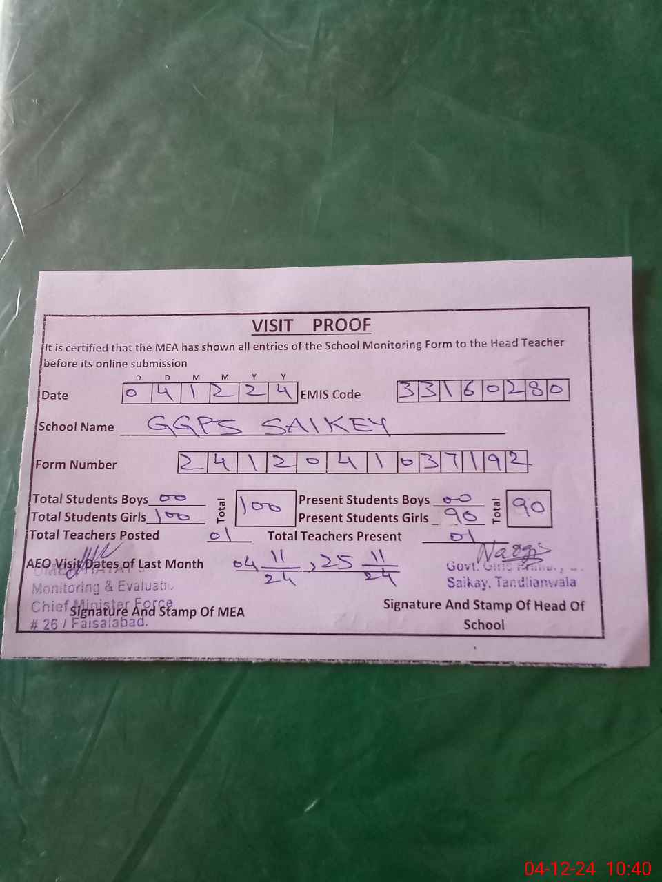 | Attendance Register | Head Teacher | MEA with School | Visit Proof |