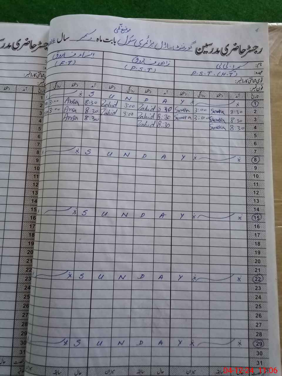 | CNIC | Full Name | Designation | R/C | Absence During Last Calender Month |