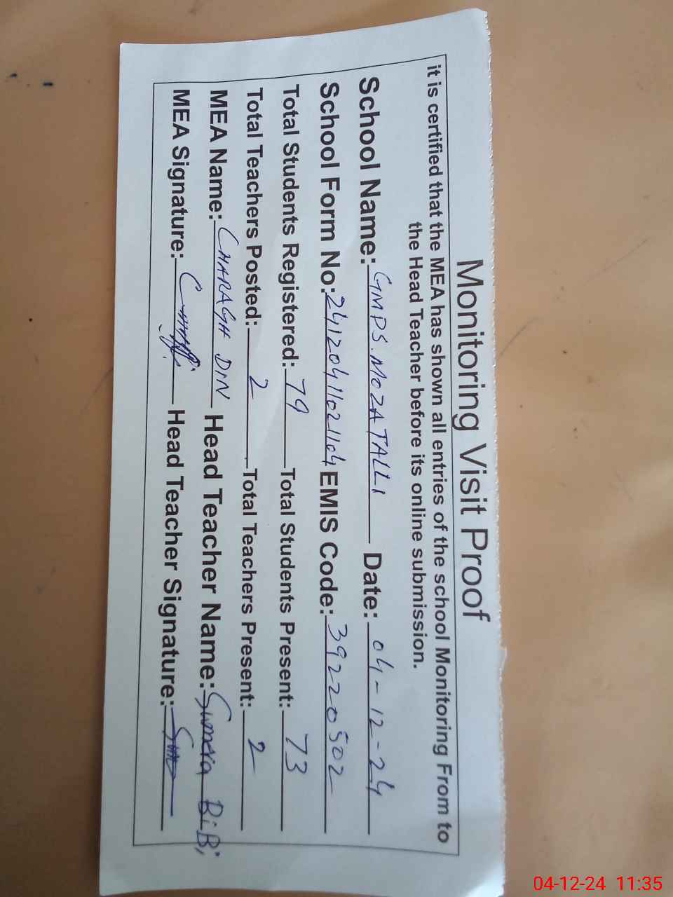 | Attendance Register | Head Teacher | MEA with School | Visit Proof |