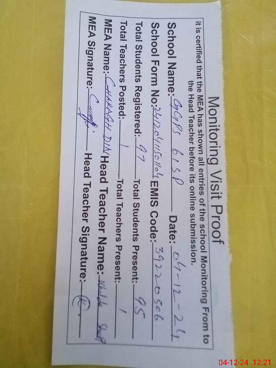 | Attendance Register | Head Teacher | MEA with School | Visit Proof |
