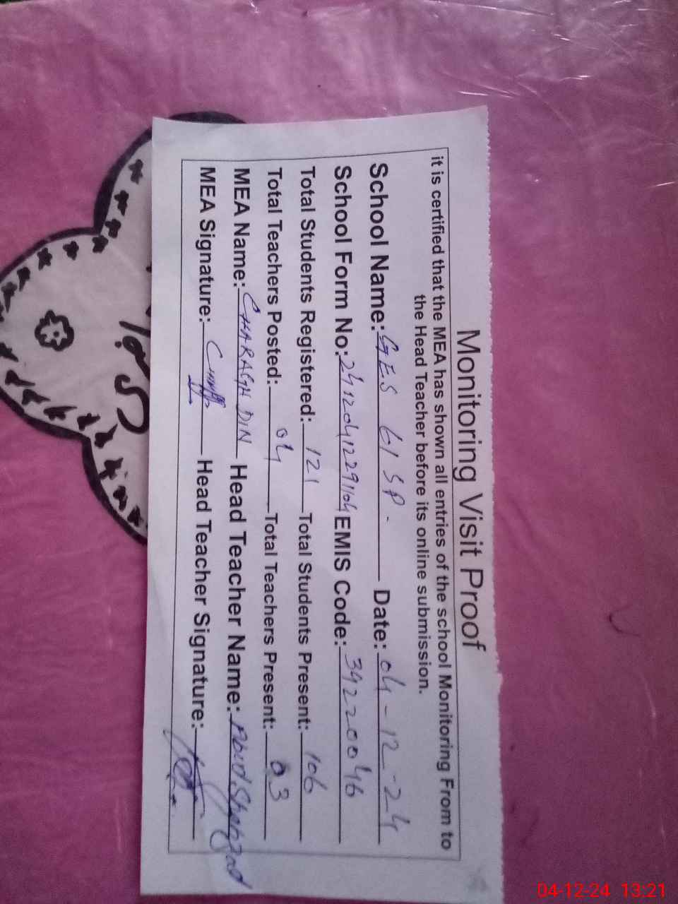 | EMIS Code: 39220046 | Name of School: GES CHAK NO. 61 / SP | |||
