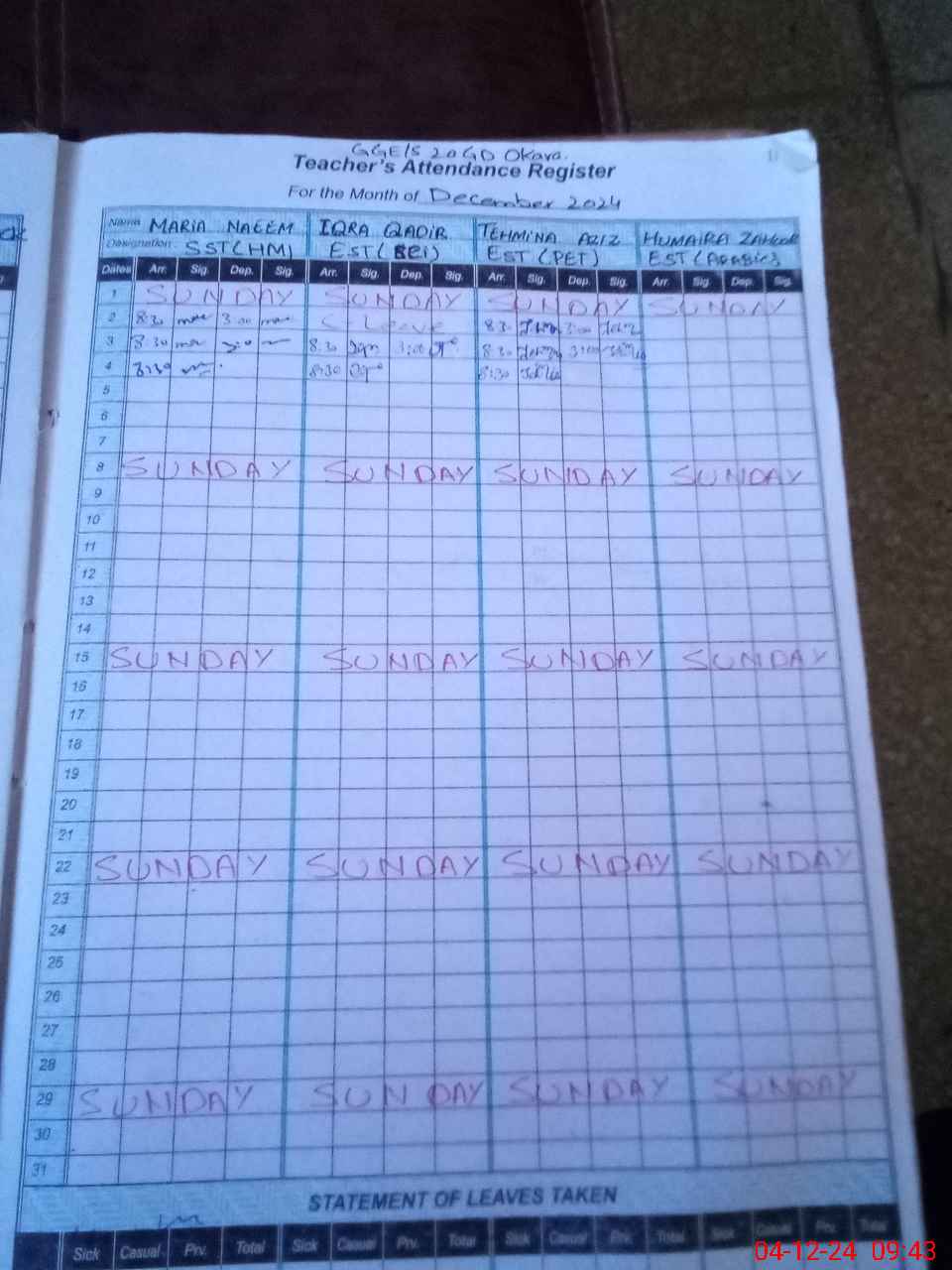 | Leave | Duty | Absent | Maternity | Medical | Ex- Pak |