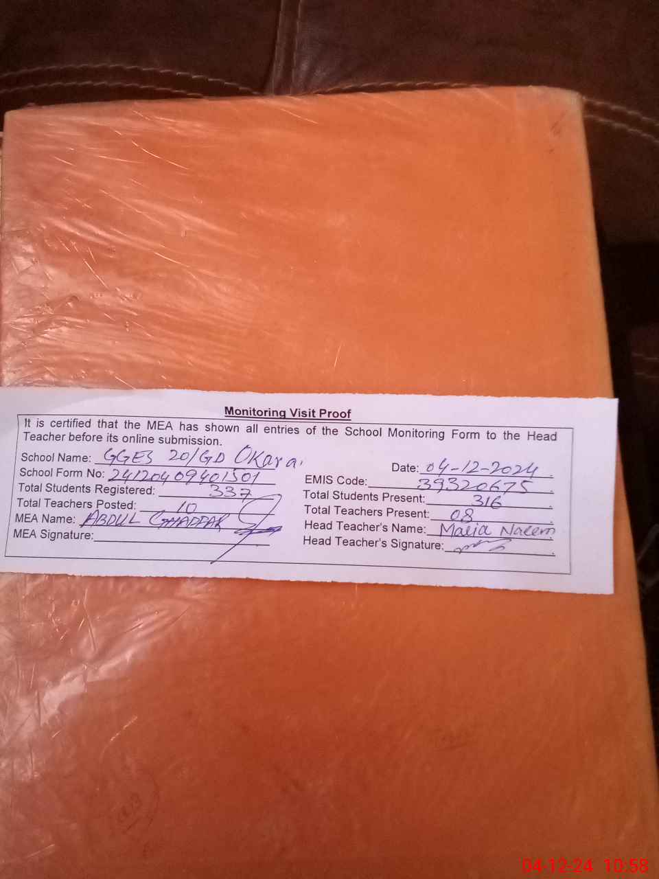 | Attendance Register | Head Teacher | MEA with School | Visit Proof |