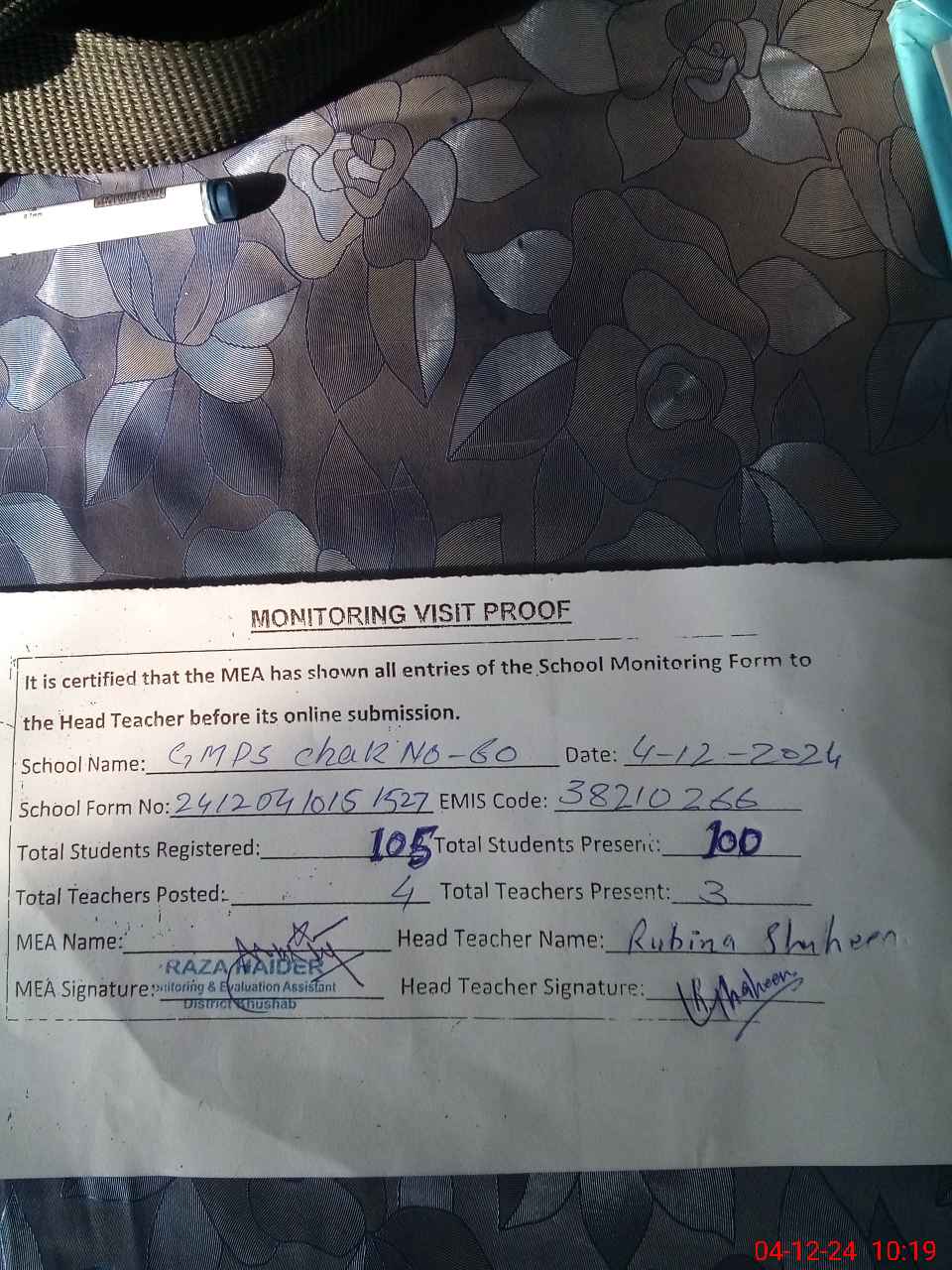 | Attendance Register | Head Teacher | MEA with School | Visit Proof |