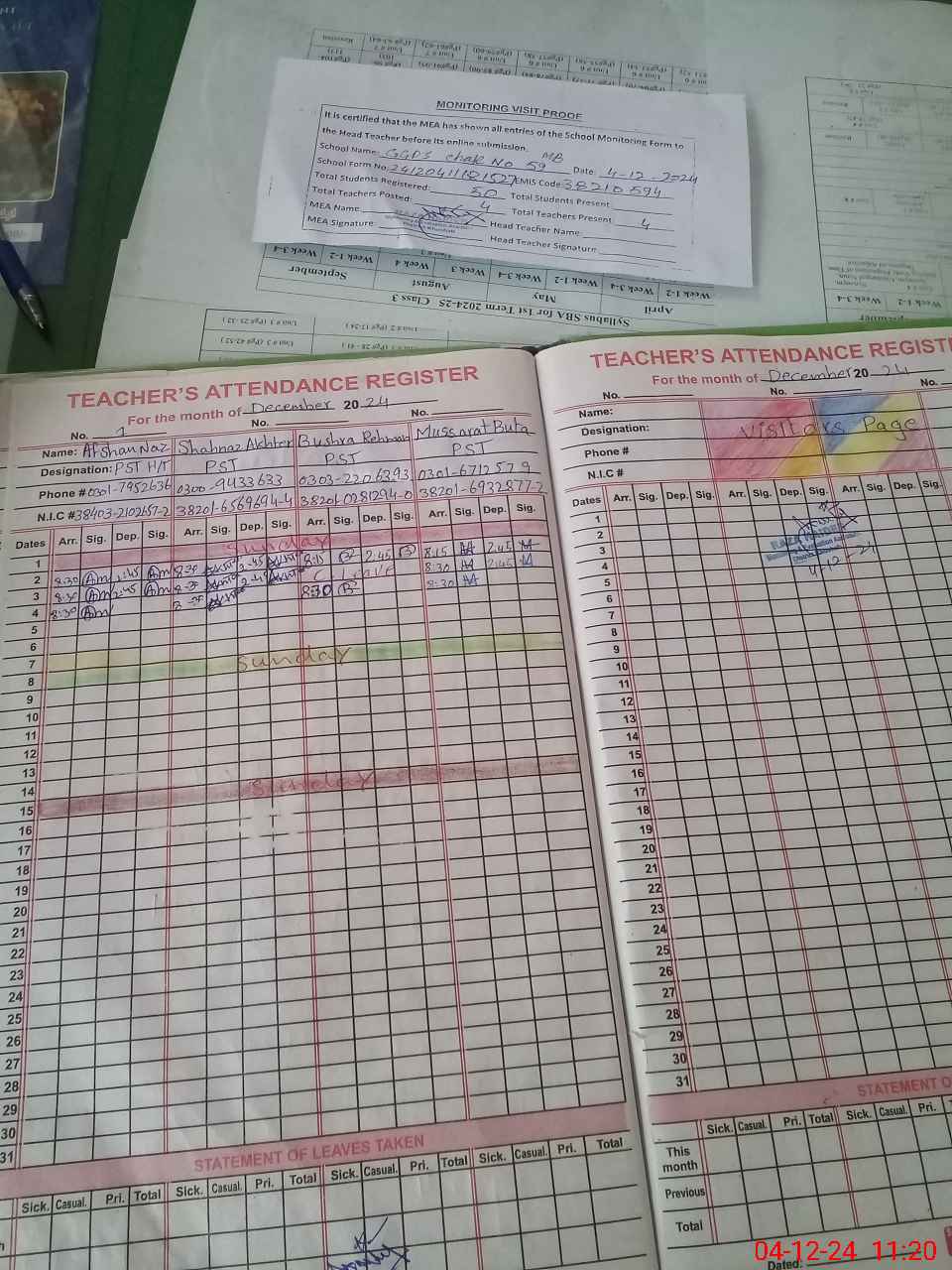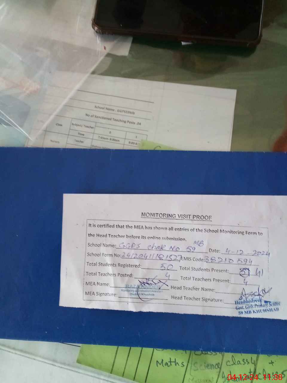 | Attendance Register | Head Teacher | MEA with School | Visit Proof |
