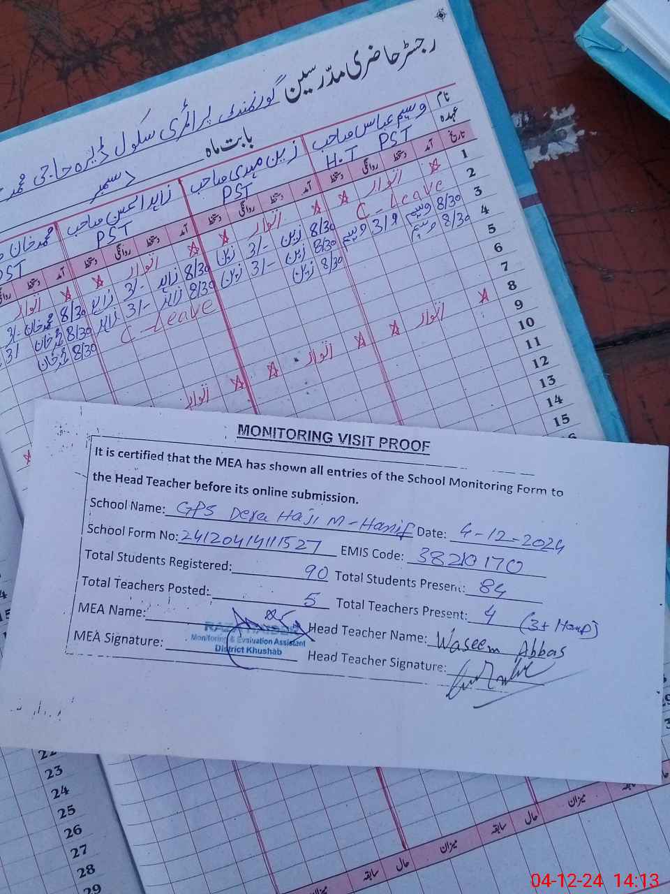 | Attendance Register | Head Teacher | MEA with School | Visit Proof |