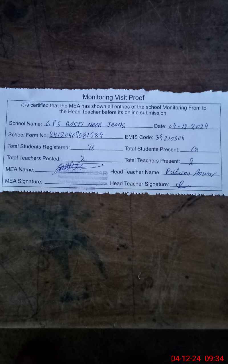 | EMIS Code: 39210504 | Name of School: GPS BASTI NOOR JHANG | |||