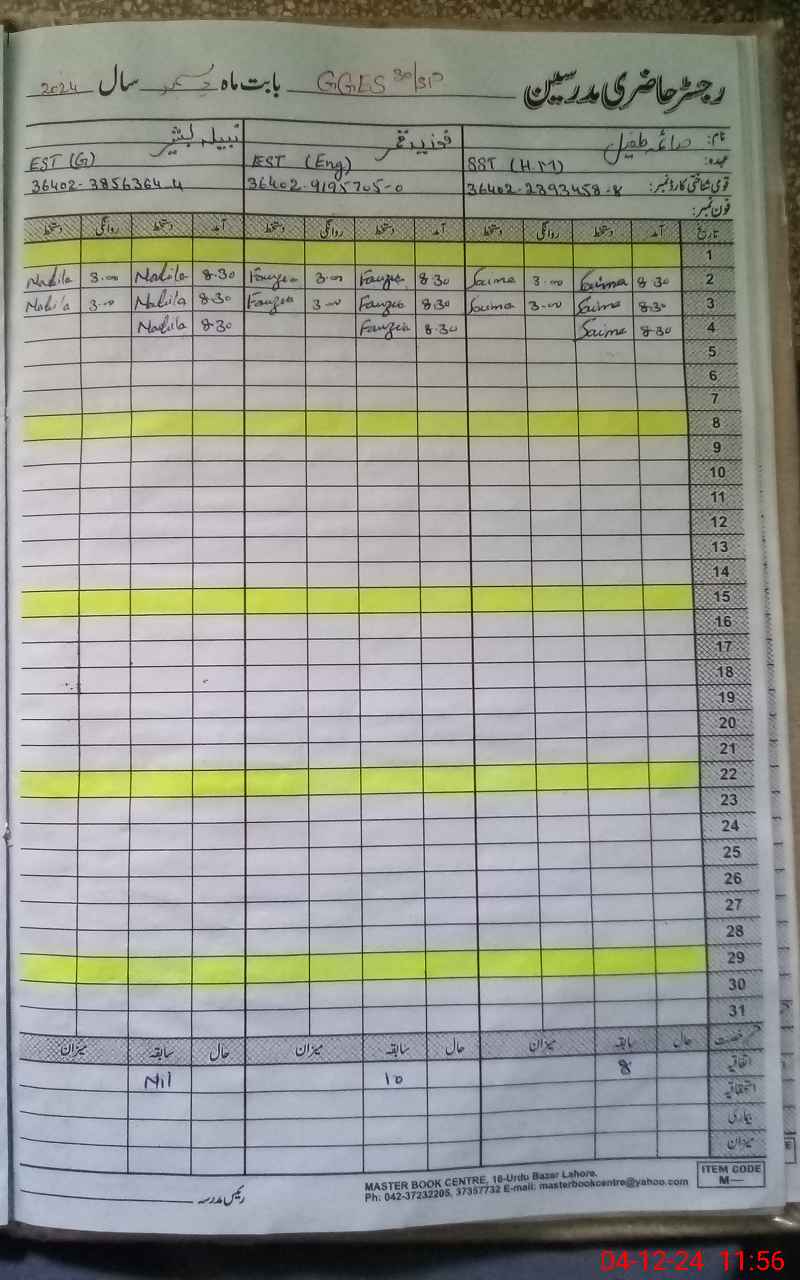 | CNIC | Full Name | Designation | R/C | Absence During Last Calender Month |