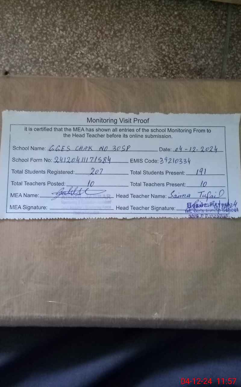 | EMIS Code: 39210334 | Name of School: GGES CHAK NO.30 SP | |||