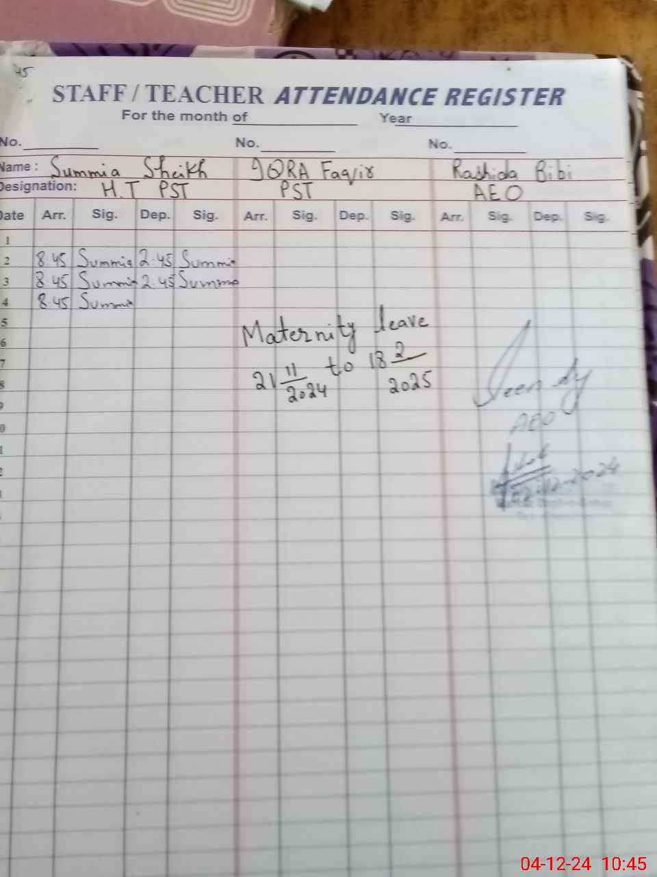 | 31**** | Iq**** Fa**** | PST | Regular | 10 | 0 | 0 | 10 | 0 | 0 | 0 | 0 | 0 | Maternity |