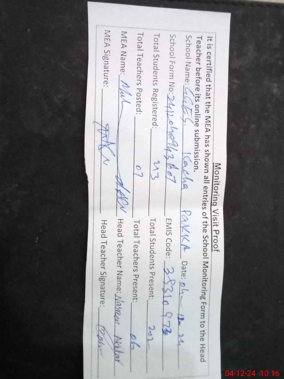 | Attendance Register | Head Teacher | MEA with School | Visit Proof |