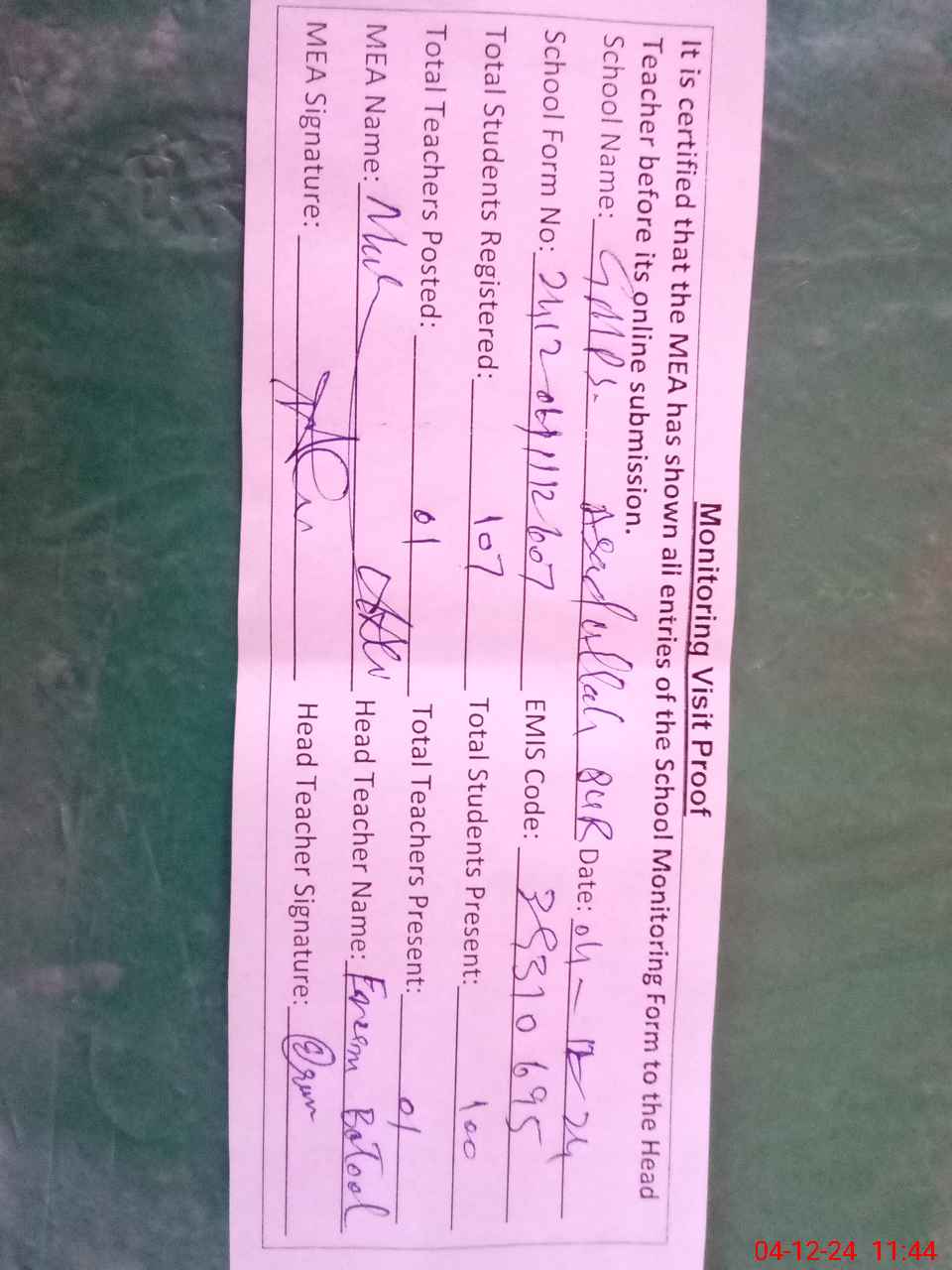 | Attendance Register | Head Teacher | MEA with School | Visit Proof |