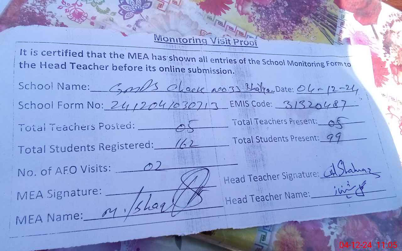 | EMIS Code: 31320487 | Name of School: GMPS CHAK NO. 33/A BHUTTIAN | |||