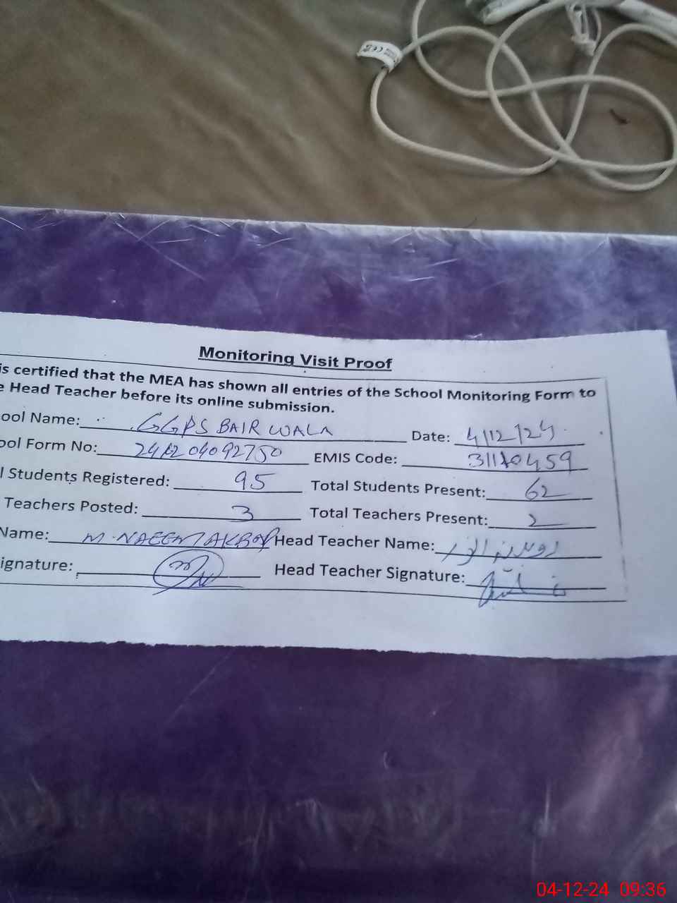 | EMIS Code: 31110459 | Name of School: GGPS BAIR WALA NO.1 | |||