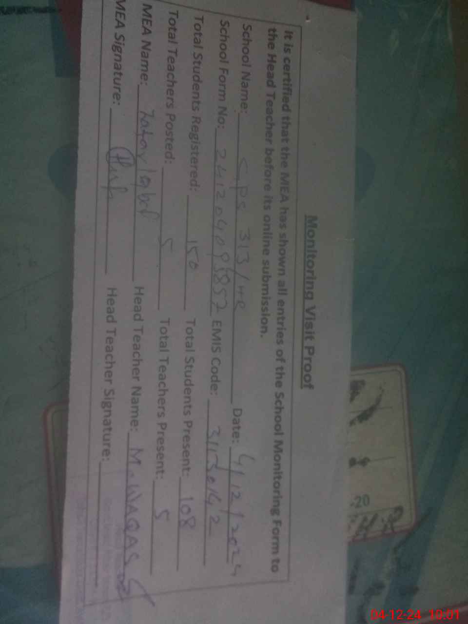 | Attendance Register | Head Teacher | MEA with School | Visit Proof |