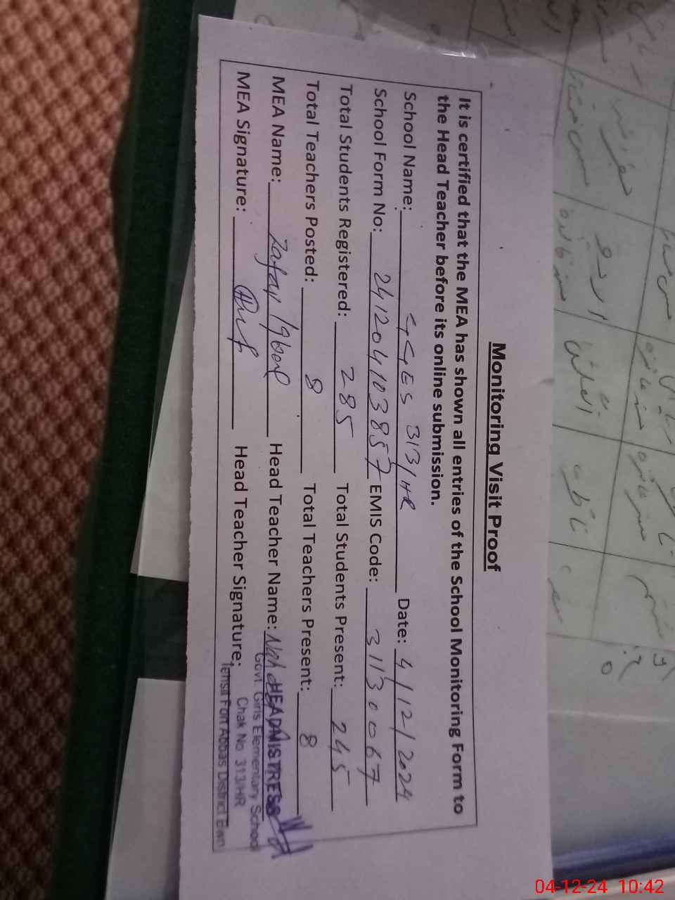 | Attendance Register | Head Teacher | MEA with School | Visit Proof |