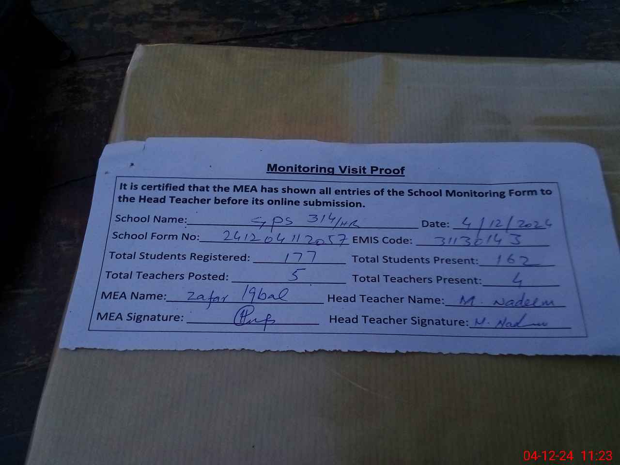 | Attendance Register | Head Teacher | MEA with School | Visit Proof |