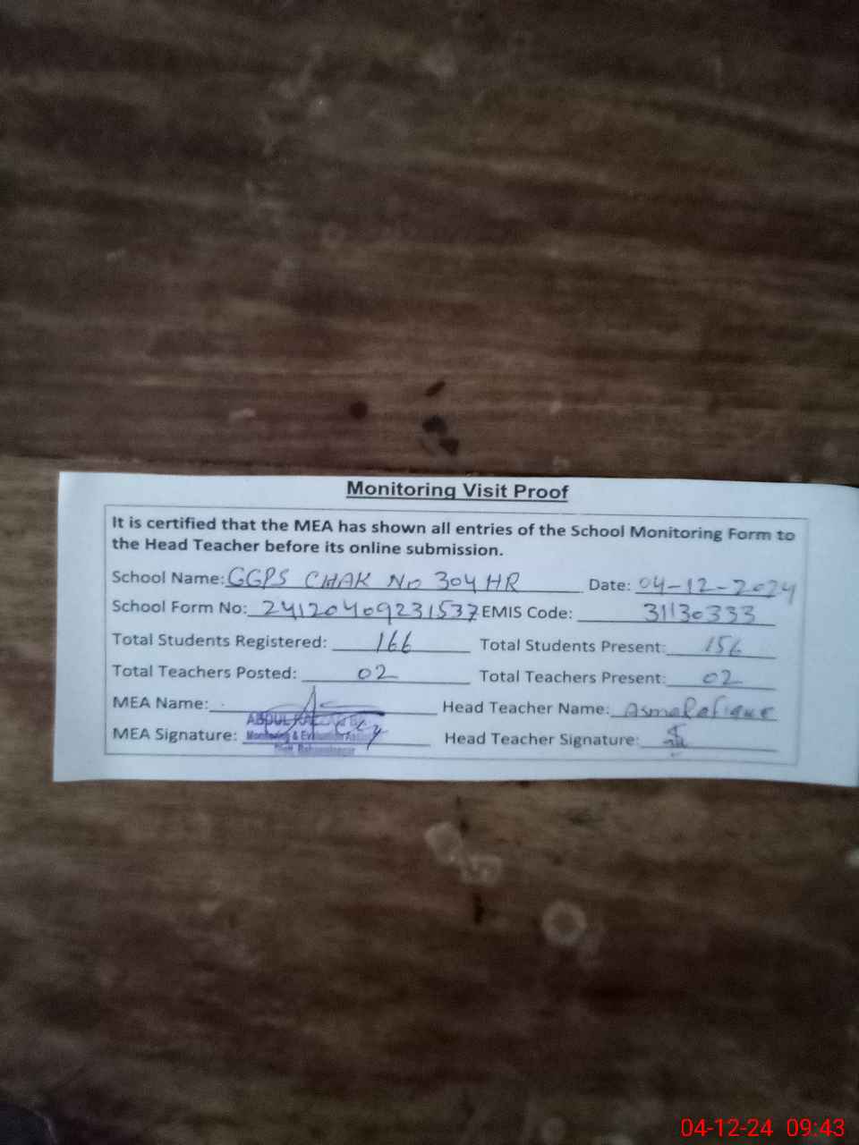| EMIS Code: 31130333 | Name of School: GGPS CHAK NO 304 HR | |||