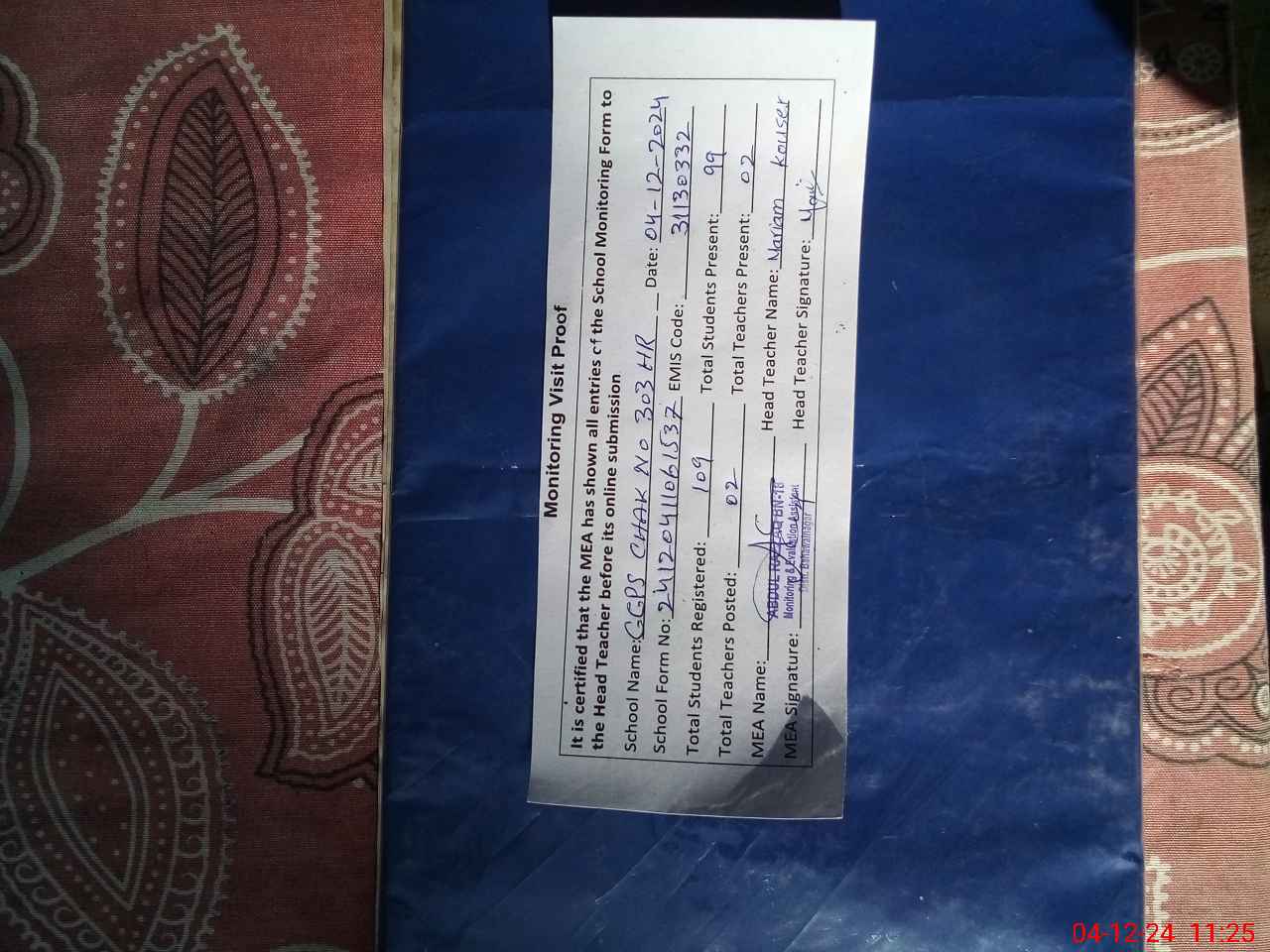 | Attendance Register | Head Teacher | MEA with School | Visit Proof |