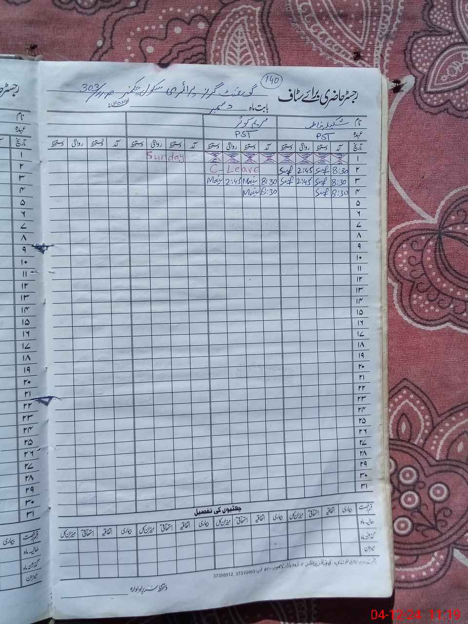 | CNIC | Full Name | Designation | R/C | Absence During Last Calender Month |